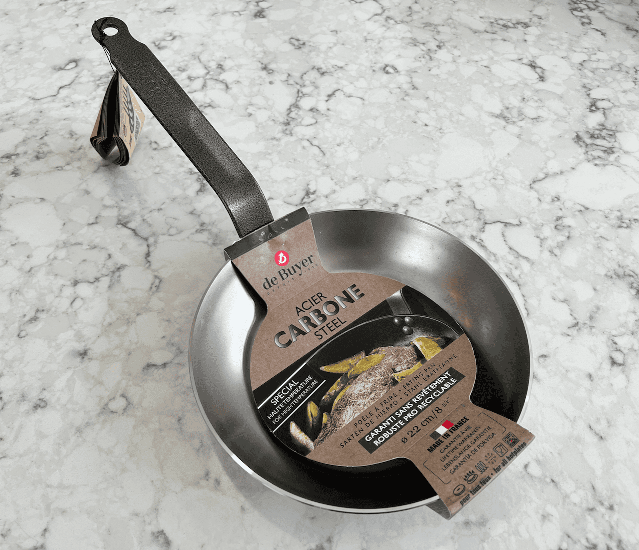 De Buyer is well-known for their Mineral B line of carbon steel skillets, but that line is consumer focused, and as such is lighter (meaning thinner steel), has a beeswax coating over the pan to protect it, as well as having some decoration on the handle.